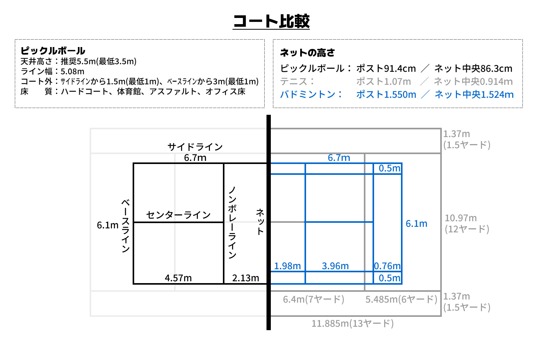 [JPEG]コート寸法比較(バドミントン・テニス・ピックルボール)